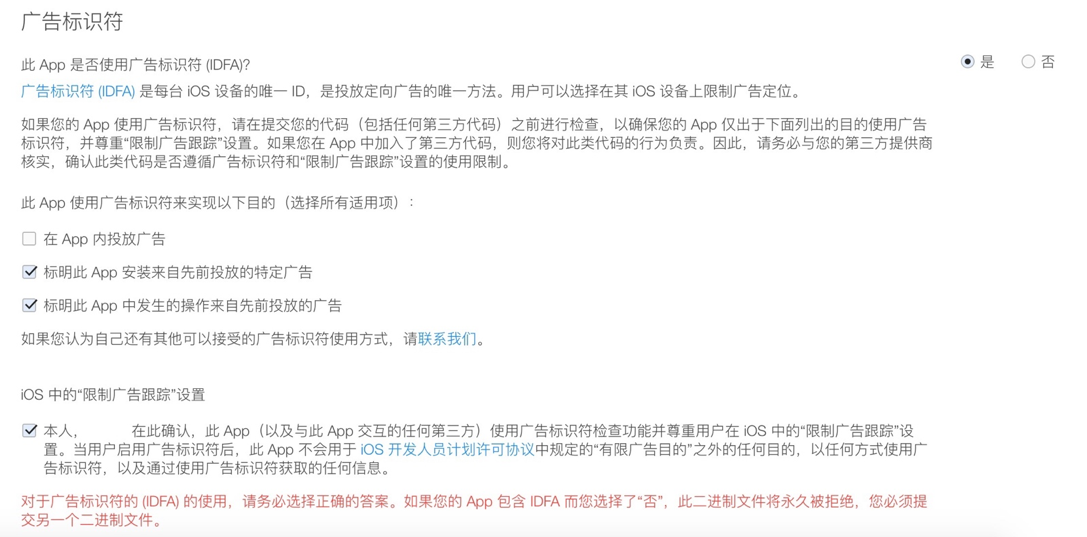注意事项:集成GInsight SDK需要使用到IDFA所以必须添加AdSupport.framework,并且为了审核通过需要勾选如图: